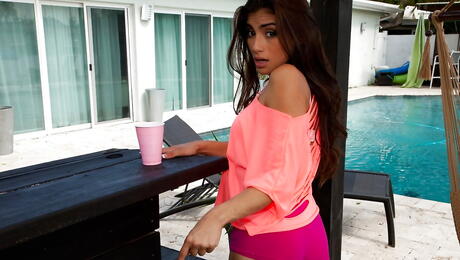 Charming american babe Michelle Martinez in fancy shorts reveals big titties and sexy butt outside