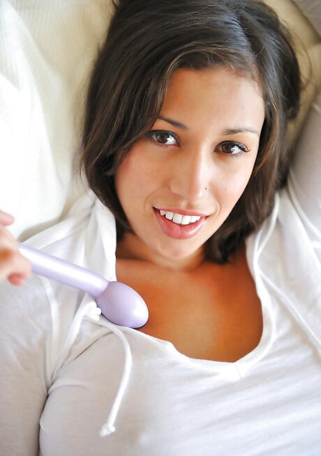 Charming brunette babe Isabela exhibiting big hooters and loving dildo
