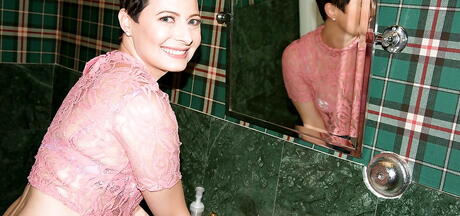 Curious american aged Kali Karinena bares small tits and masturbates in bathroom