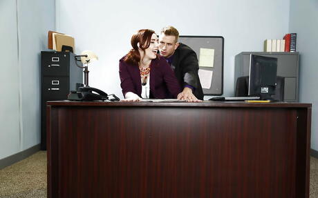Curious american Ember Stone banged in her hairy beaver after hot cock suck in office
