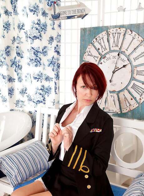 Curious british redheaded mature Scarlet Rose in uniform outfit exposes her butt and hairy beaver