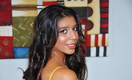 Curious latina Jade Riley in sexy jeans uncovering small tits and spreading her legs