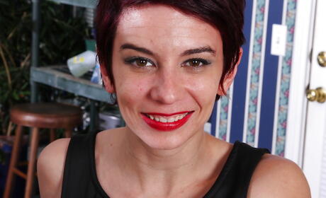 Curious mature Nikki Lee in sexy undies showing small tits and spreading her legs