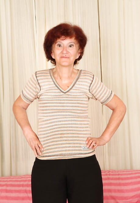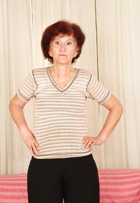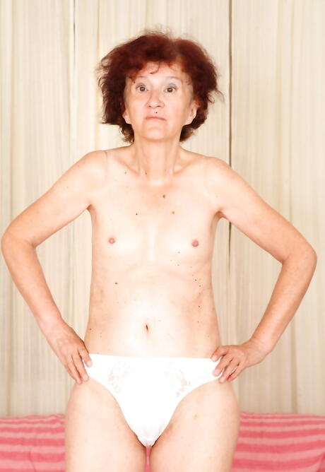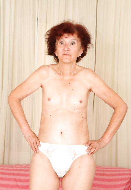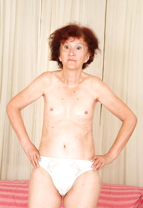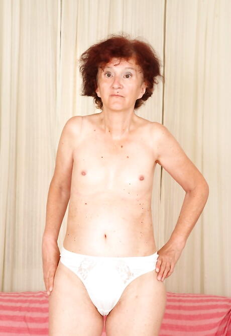 Curious redhead grannie Marcelina shows tiny tits while stripping out