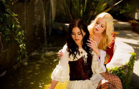 Curious women Shyla Jennings and Charlotte Stokely make some playful lesbian action outside