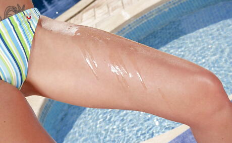 Delightful czech babe Karolina King in bikini baring big boobs and pussy at pool