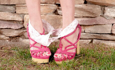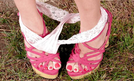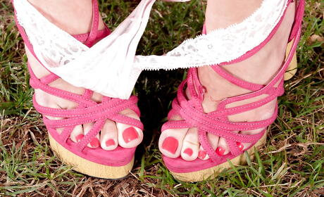 Delightful latin blond milf Mia Lelani in sexy skirt loves some hot foot fetish outdoor
