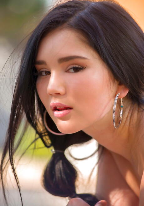 Delightful pornstar Malena in sexy skirt exhibits big tits and shaved pussy at pool