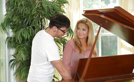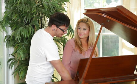 Deluxe blond Patricia Price in fancy skirt sucks on dick and enjoys a cum blast in mouth