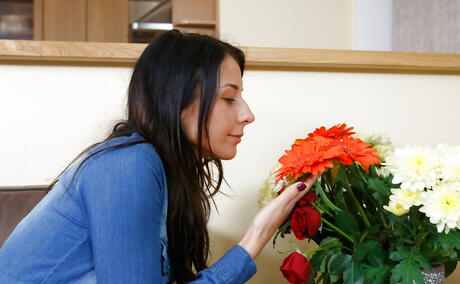 Deluxe dark hair babe Elizabete in tight jeans toys her cunt