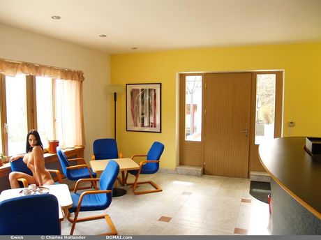 Adorable teen Gwen models naked in a hotel room with a view of the ocean