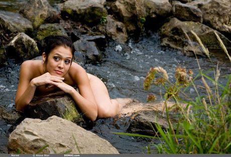 Angelic teen Naree poses naked in the middle of a river while on vacation