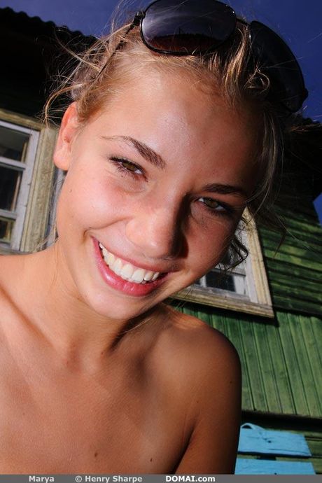Attractive teen Marya gets naked in sunglasses and sandals on a patio