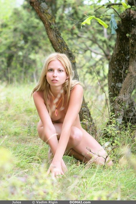 Blonde teen Jules models totally naked in a secluded area of a forest