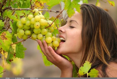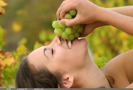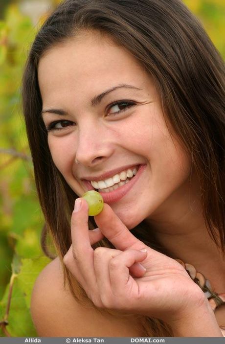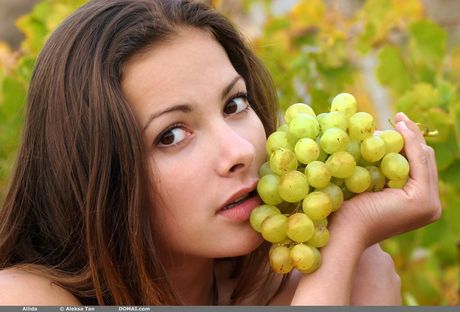 Delicate teen Allida poses naked with a bunch of grapes in her hands