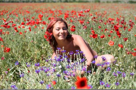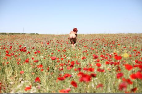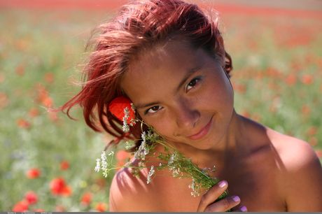 Delicate teen Nastia A poses nude in a field of poppies & exhibits her bald pussy