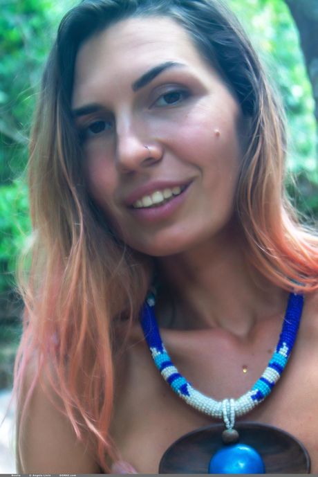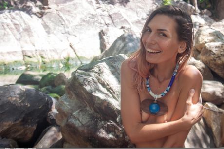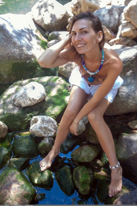 Delicate teen Noelia takes it all off on a patch of grass in a yard
