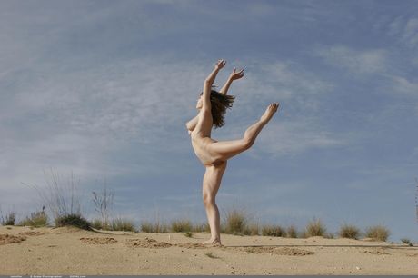 Gorgeous teen Jennifer exhibits her big tits and hot ass on a sandy beach