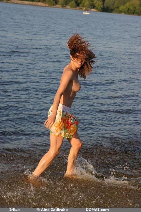 Lean teen Iriisa poses naked on the beach and in the water