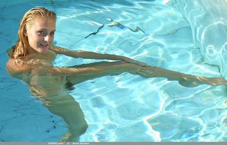 Lean teen Kitty gets naked in a pool and shows her hairy pussy up close