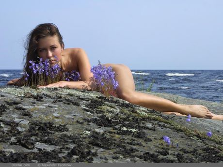 Lean teen Natalie with long hair and tiny tits poses nude in the window