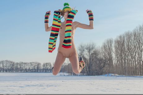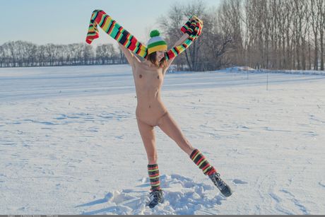 Pretty teen Sugary models totally naked in the snow-covered backyard
