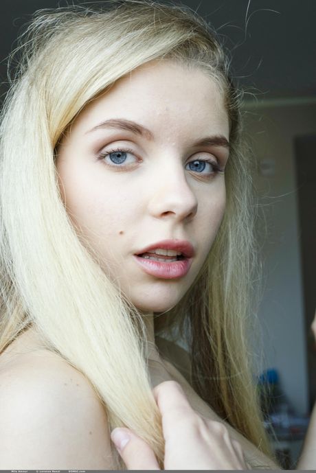 Skinny blonde teen Mila Amour gets naked in the backyard