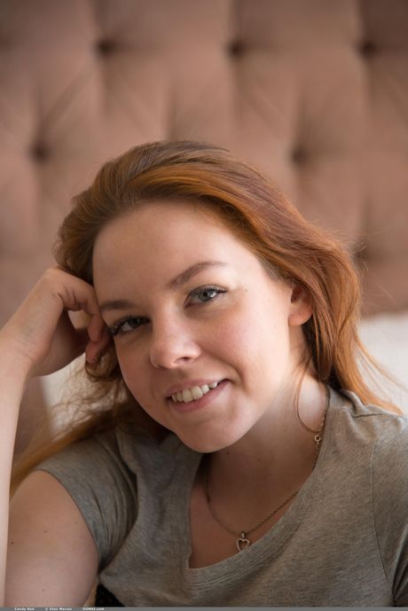 Skinny redheaded teen Candy Red displays her small tits and poses naked