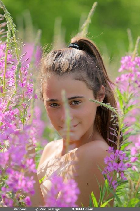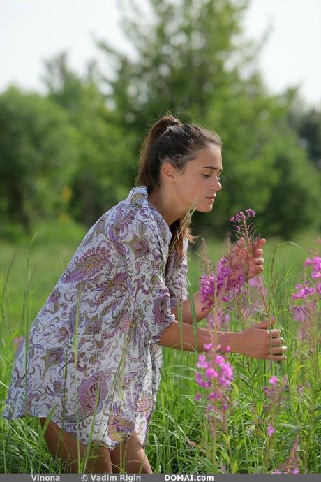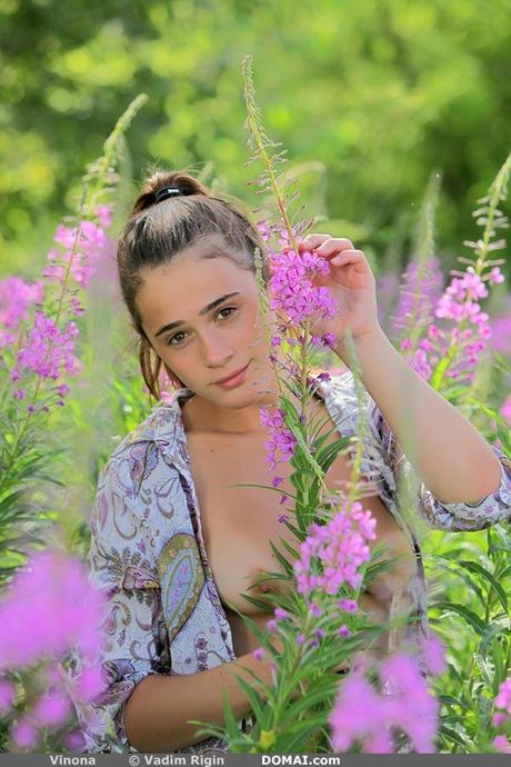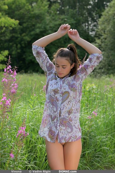 Skinny teen Vinona poses naked in the field & shows her small tits & bald pussy