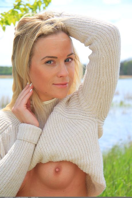 Teen model Cristal Caitlin poses naked in white socks on a patio