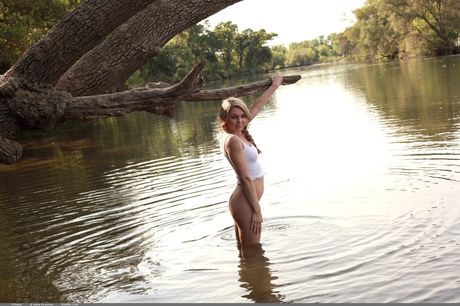 Thin teen Tiffiny shows her small tits and poses naked in a solo