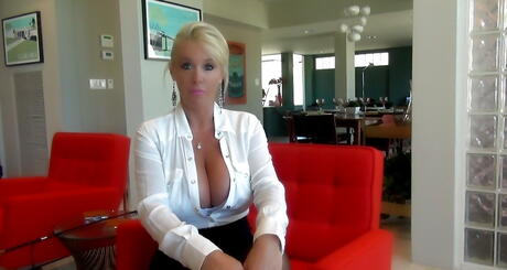 Enchanting american blond homemaker Sandra Otterson in fancy skirt showing big titties and hot butt