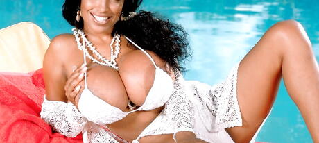 Enchanting brazilian milf Busty Angelique in undies exposing big knockers and spreading her legs near the pool