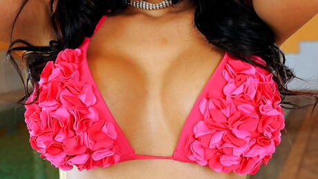 Enchanting british babe Rio Lee in fancy bikini denudes big boobies and butt near the pool