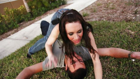 Enticing american milf Rayveness in sexy jeans suck big dick and take it in hairy pussy