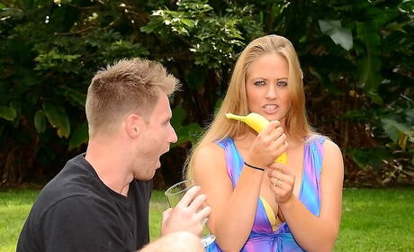 Enticing american panther Holly Heart sucking deep cock and gets a cumshot on her face outdoor