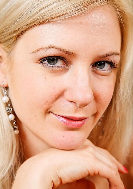 Enticing blonde milf Laurita exhibiting big knockers and puting a toy in her pussy