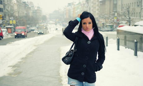 Enticing czech brunette cutie Ashley Bulgari in sexy skirt exposes big hooters and nice pussy outdoor