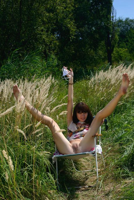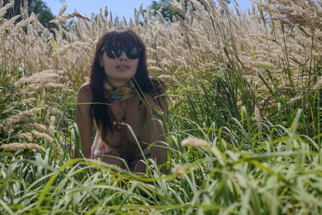 Beautiful teen Black Mo gets naked in sunglasses on a patch of grass