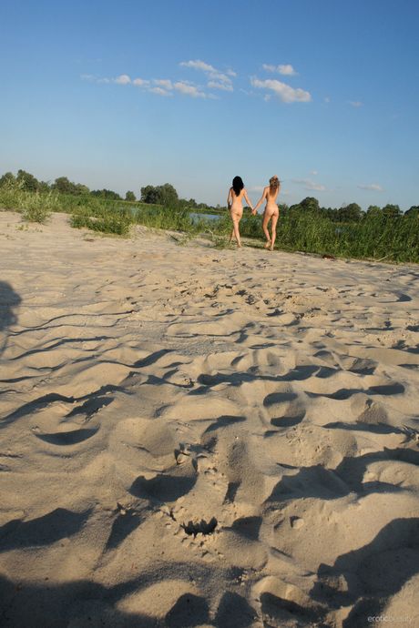 Beautiful teen lesbians Nora A & Kristini get naked on a sandy beach