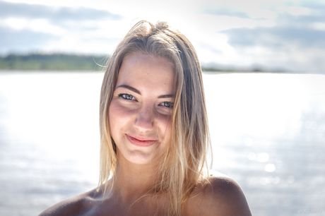 Blonde girl Angelica B poses totally naked on a sandy beach