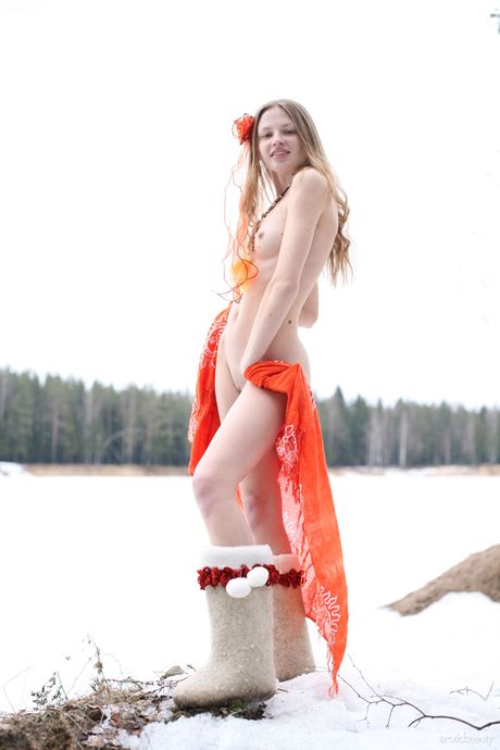Blonde teen Lyubov models naked in the snow while wearing a red hat