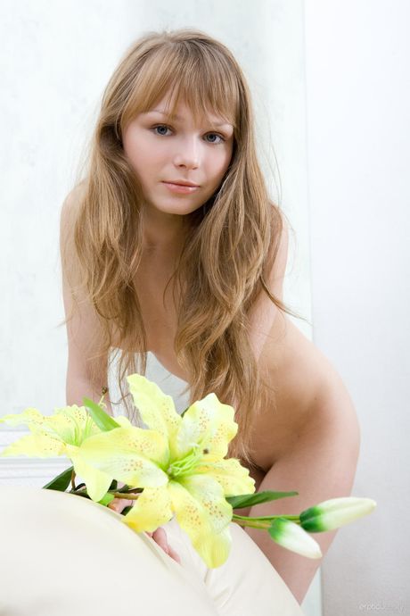 Blonde teen Mia C removes a black dress to pose nude in a kitchen
