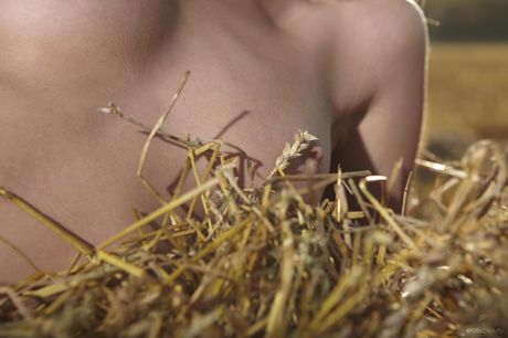 Blonde teen Nelly A removes a thong to pose naked on a bale of hay