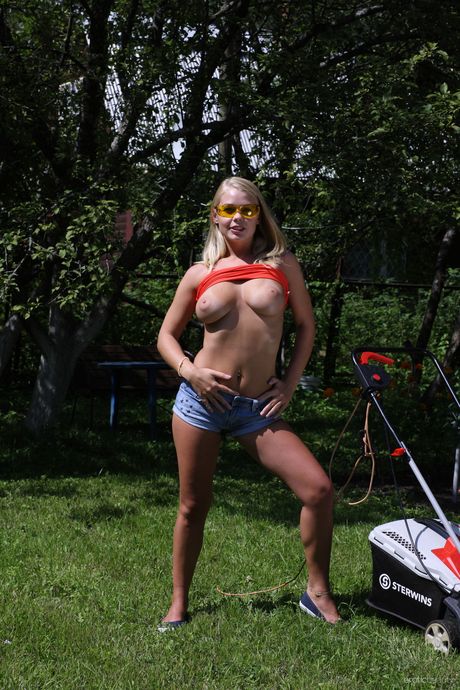 Blonde teen Sarika A goes naked on a lawn mower