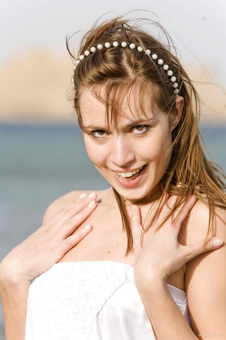 Brunette babe Alizeya A presents her small tits and hairy pussy on the beach