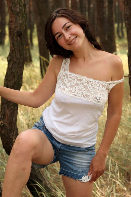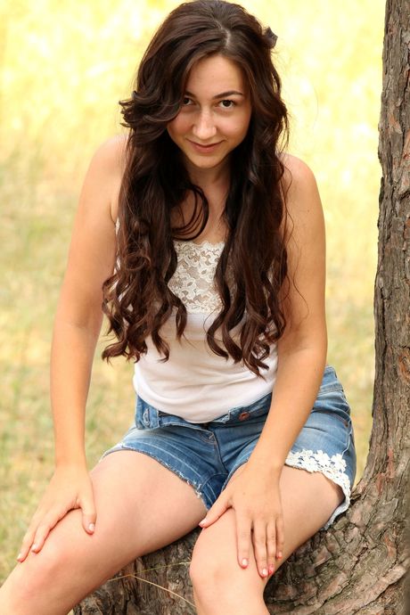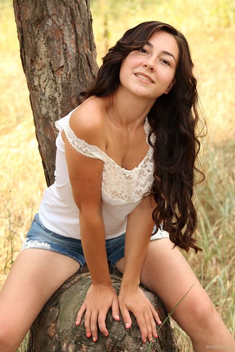Brunette babe Reba exhibits her big natural tits and poses nude in a solo