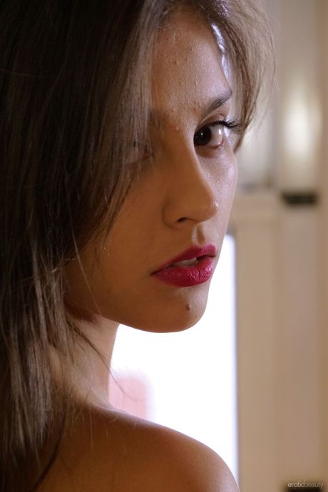 Brunette teen Camnila gets naked in the bathroom while wearing lipstick