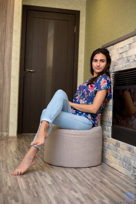 Cute teen Bikiney removes her jeans to pose nude in a fur