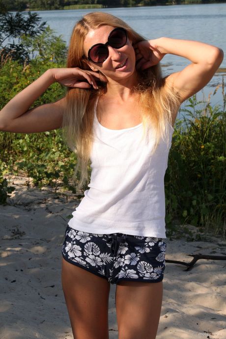 Delicate teen Terina gets naked on a beach before squirting in the water